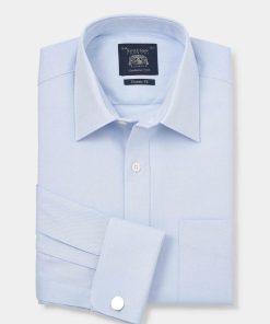 Savile Row Men’s Sky Blue Textured Cotton Herringbone Classic Fit Formal Shirt – Double Cuff | Sky
