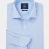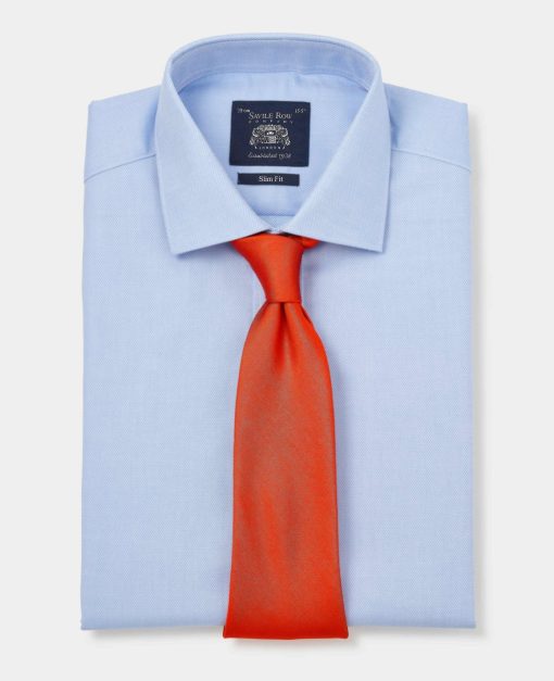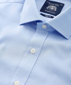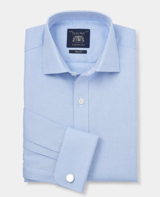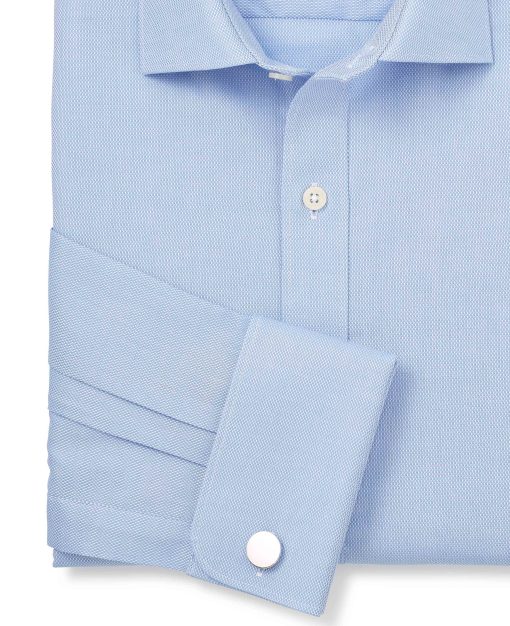 This men’s blue formal shirt is the perfect alternative to white, offering a fresh yet equally sophisticated look. The subtle textured pattern, created by the dobby weave, adds depth and character to the fabric, while still maintaining a refined appearance. This unique weave not only enhances the shirt’s durability but also improves breathability for all-day comfort. The slim fit contours to your shape, providing a sharp, modern silhouette, while the double cuffs add an extra touch of elegance.