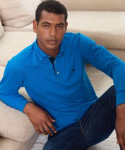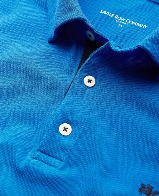 Crafted from breathable pique cotton, this blue long sleeve polo shirt is a staple every collection needs. Thoughtful detailing sets it apart: a contrast navy inside neck placket, cross-stitching on the button placket, elegant crest embroidery and herringbone tape at the side slit all give it a premium finish. The long sleeves add a touch of polish, while the self-fabric two-piece collar with a concealed undercollar button keeps your look sharp and in place—no more collar curl.