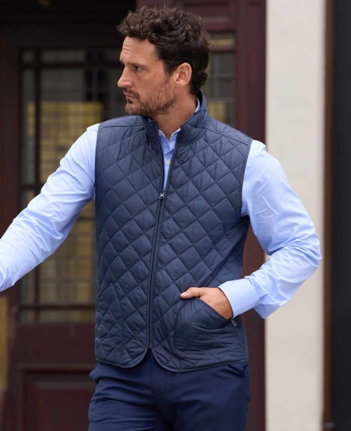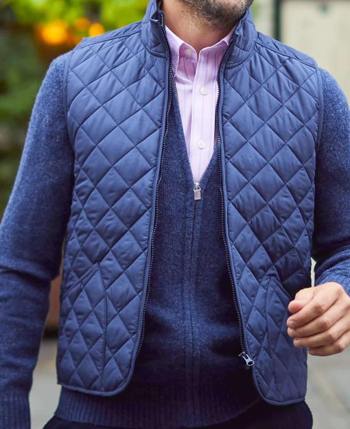 Beloved by both urban sophisticates and countryside adventurers, our navy quilted gilet effortlessly blends timeless style with practical warmth. Designed to hug the body snugly, it provides superior insulation without the bulk – ideal for layering under a suit on crisp winter days or pairing with a roll neck jumper, corduroy trousers, and brogues for a smart-casual look. Its versatile design ensures that whether you’re navigating city streets or exploring rural landscapes, you stay comfortable and impeccably styled.