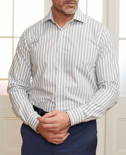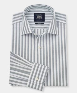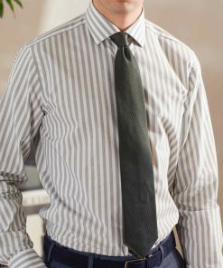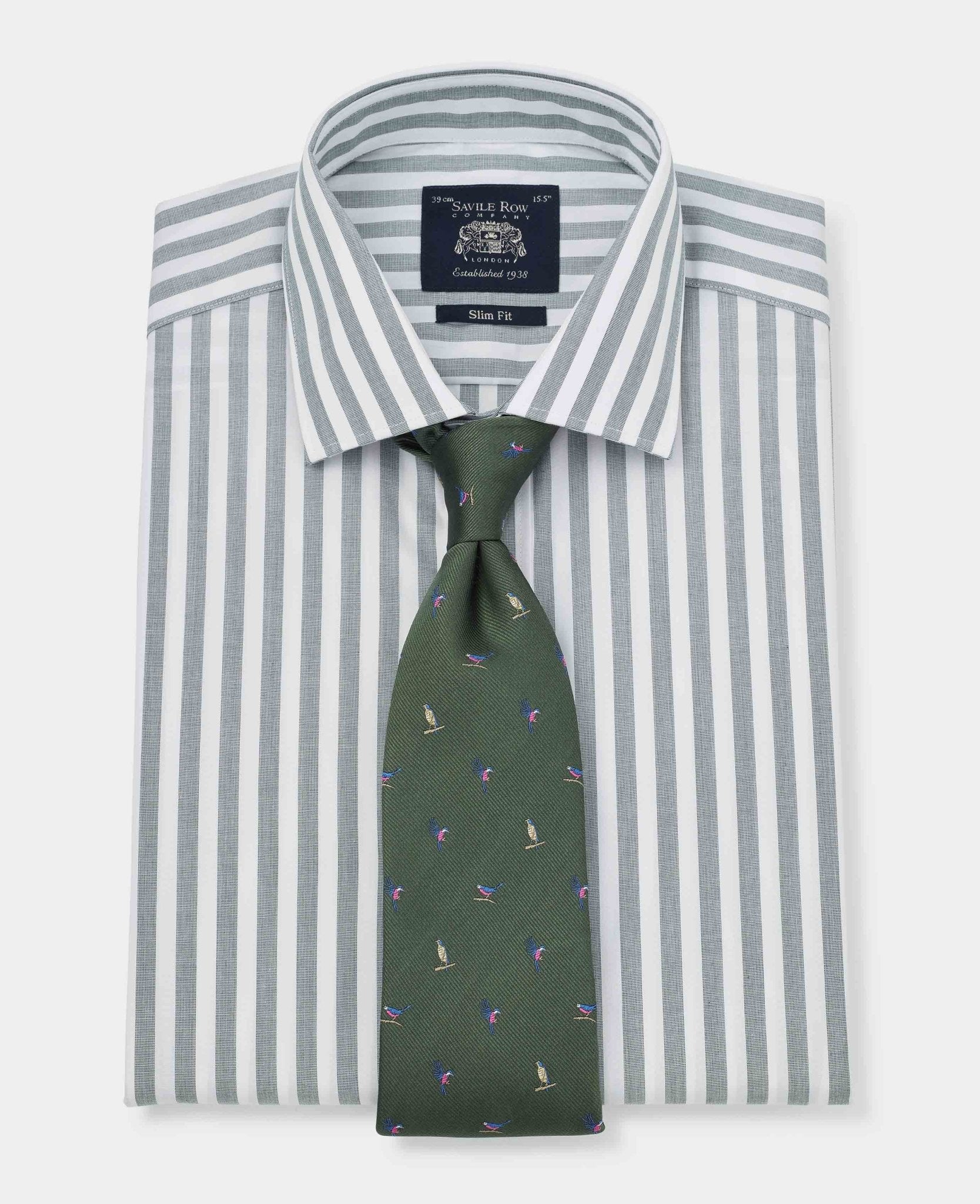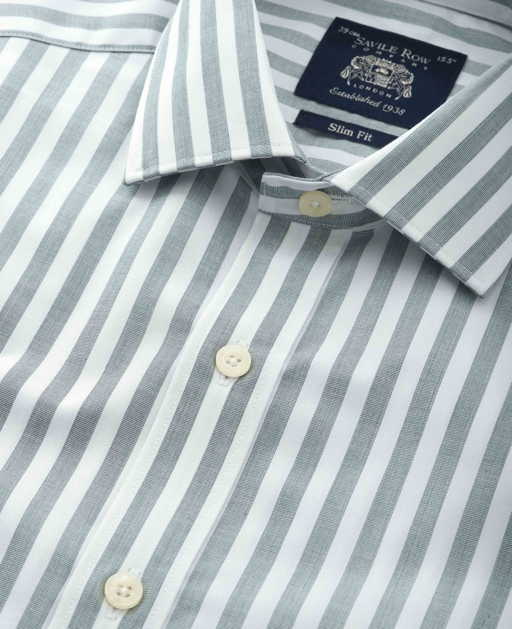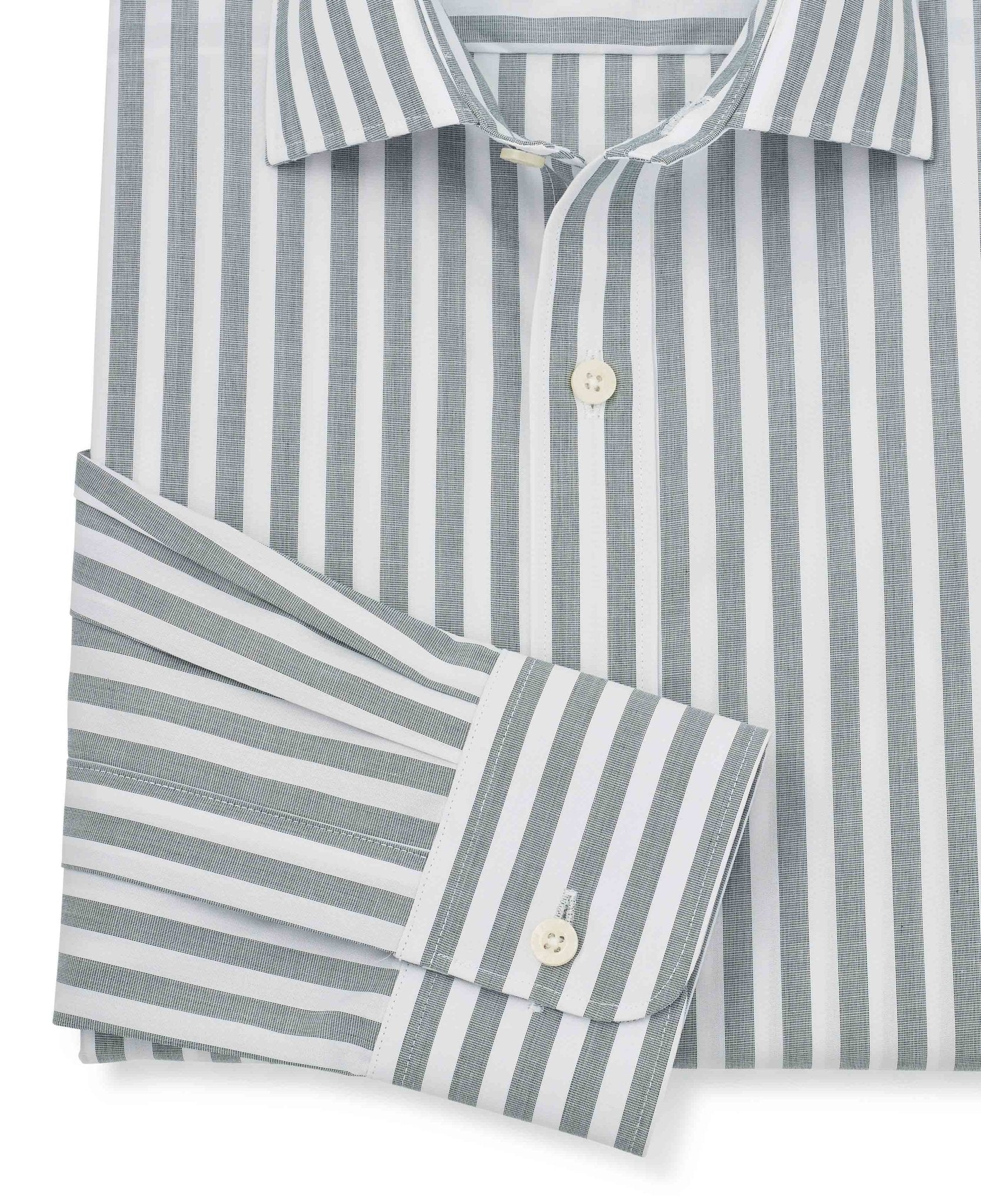 Update your formal wardrobe with this striped shirt in green and white. The ideal way to add a little colour to your ensemble, it’ll pair well with a wide range of tailoring and accessories. Complete with a curl-resistant collar and single cuffs.