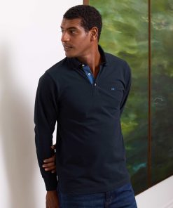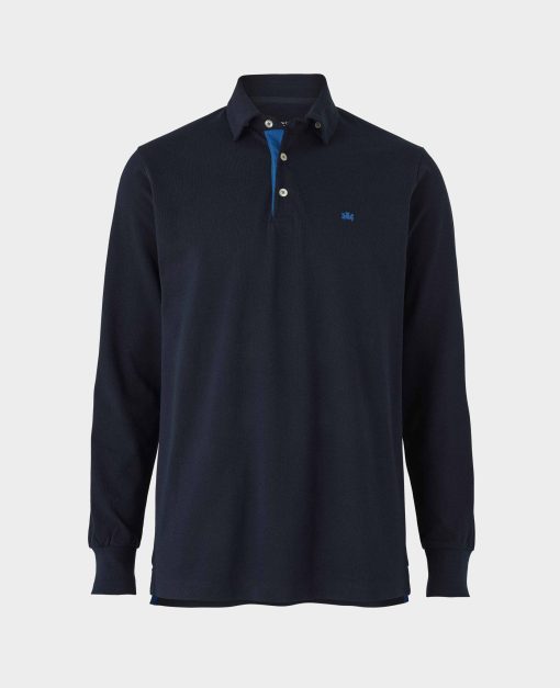 Effortlessly stylish and endlessly versatile, our navy long-sleeved polo shirt is your all-occasion essential. Crafted from breathable cotton pique, it delivers all-day comfort that works year-round. Its classic fit and smart two-button placket keep things polished, while premium touches like the concealed undercollar button, contrast inner placket, crest embroidery and herringbone side slits set it apart.