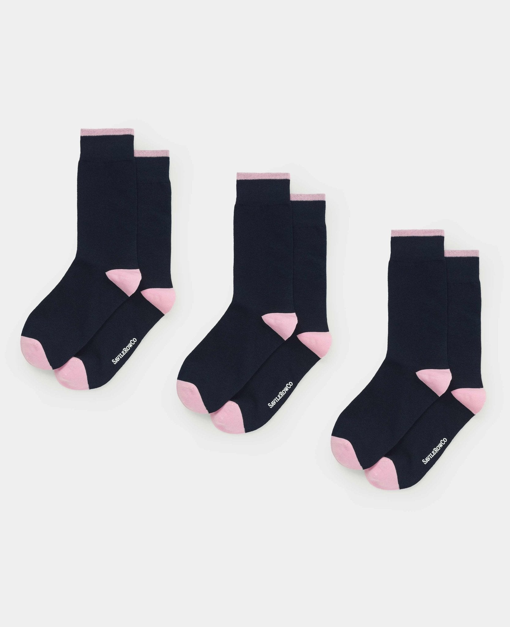 Step up your sock game with this stylish pack of three navy socks. Each pair features a sleek navy base with classy pink accents, adding a pop of colour to your everyday wardrobe. Made from a soft, breathable cotton blend, these socks offer all-day comfort and durability. The classic design, complete with ribbed tops, ensures a perfect fit and long-lasting wear.