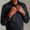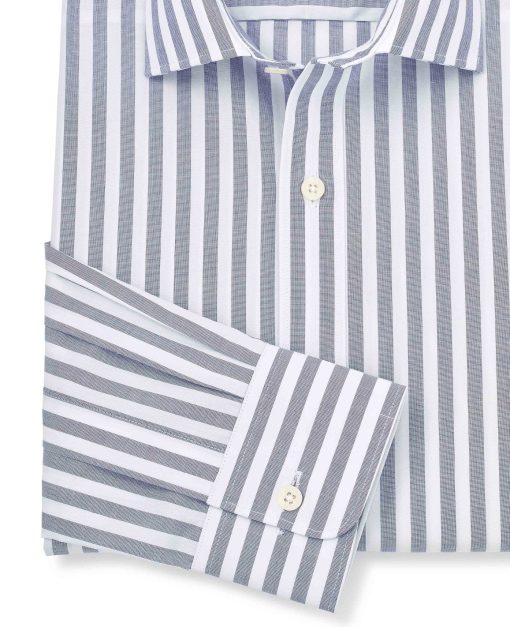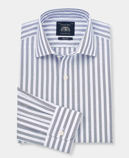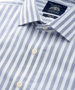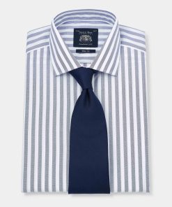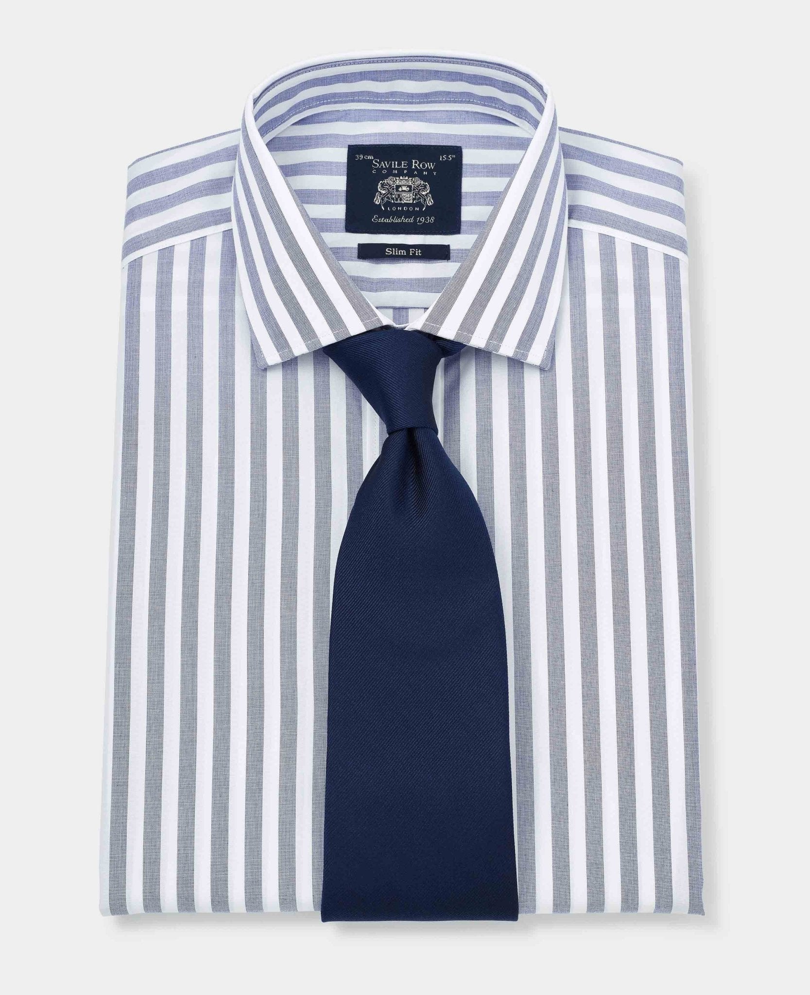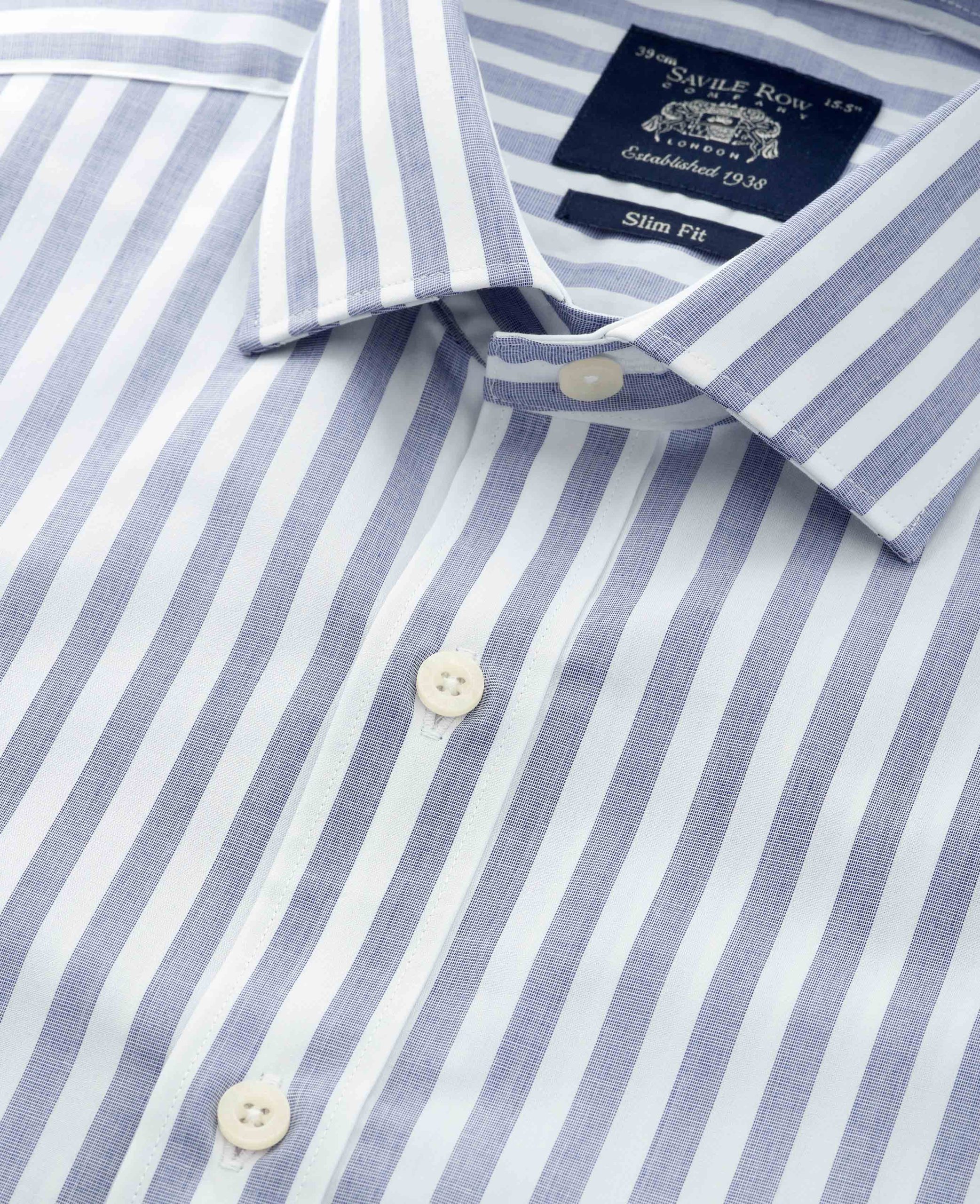 This navy and white striped shirt will bring a fresh feel to your formal ensembles. Cut to a slim fit shape with a curl-resistant collar, it can be worn with or without a tie.