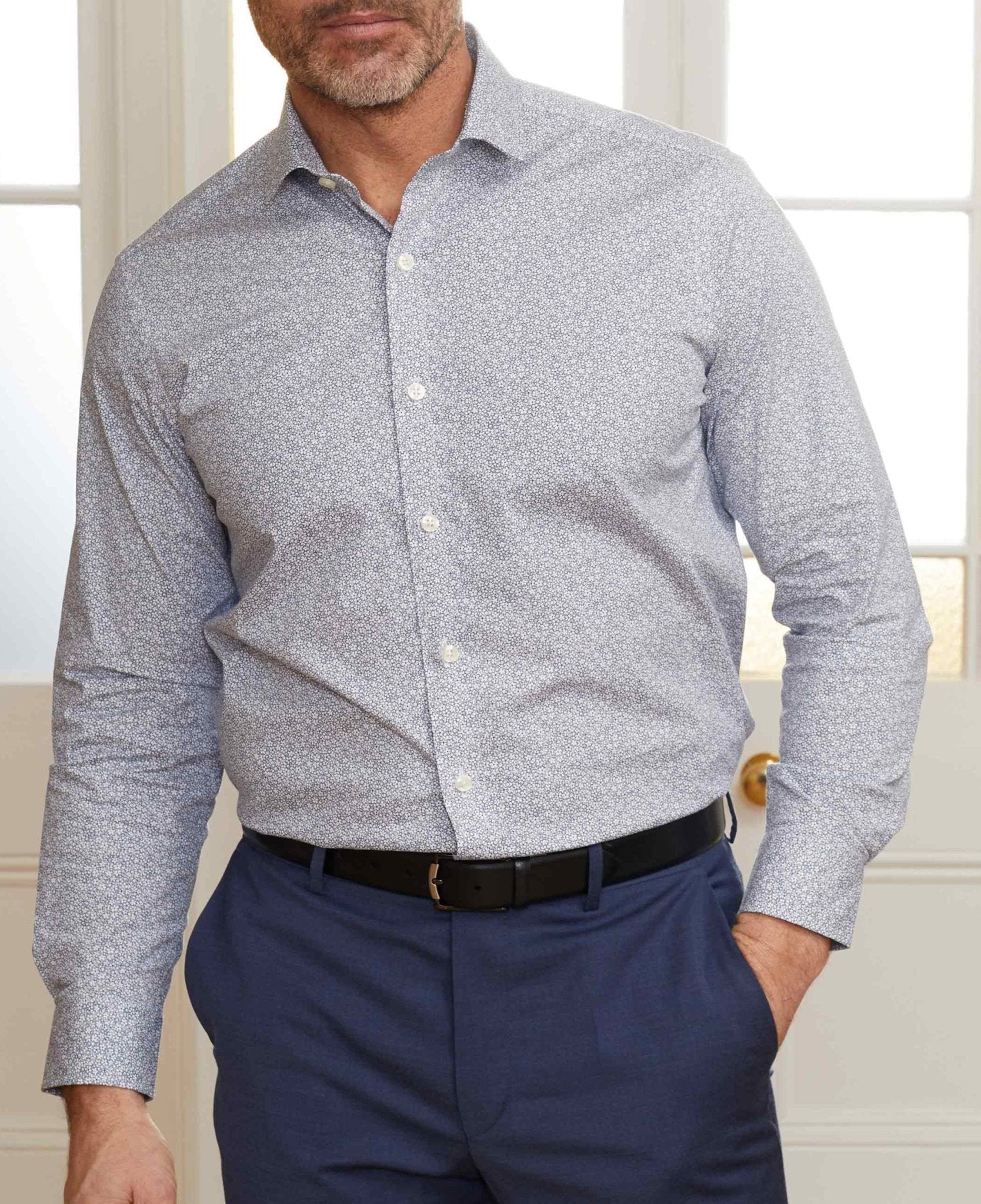 This printed shirt has been made from beautifully soft cotton with a hint of stretch to allow better movement and ultimate comfort. It’s complete with our famous curl-resistant collar but has been given a shorter hem so you can wear it untucked.