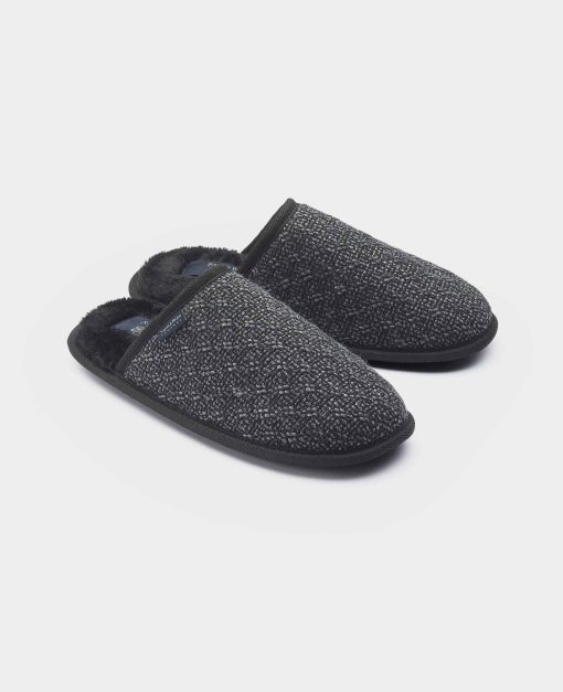 Crafted with a grey and black textured outer and lined with plush black faux fur, these men’s mule slippers offer cosy warmth with Savile Row style. The easy slip-on design means you can quickly slide them on for relaxed days at home, while the lightweight rubber sole provides durable grip for indoor and light outdoor wear. Practical and low-maintenance, these slippers are simply wiped clean to keep them looking fresh.
