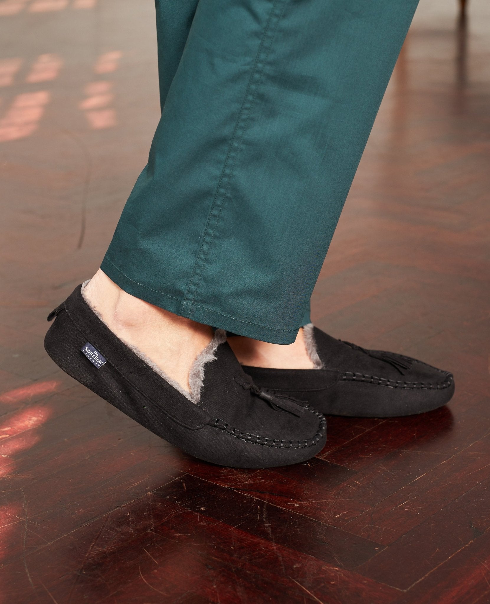 Keep feet feeling warm and cosy with our luxury men’s slippers. Made of microsuede in a classic moccasin design, they have soft faux fur lining and non-slip rubber soles.