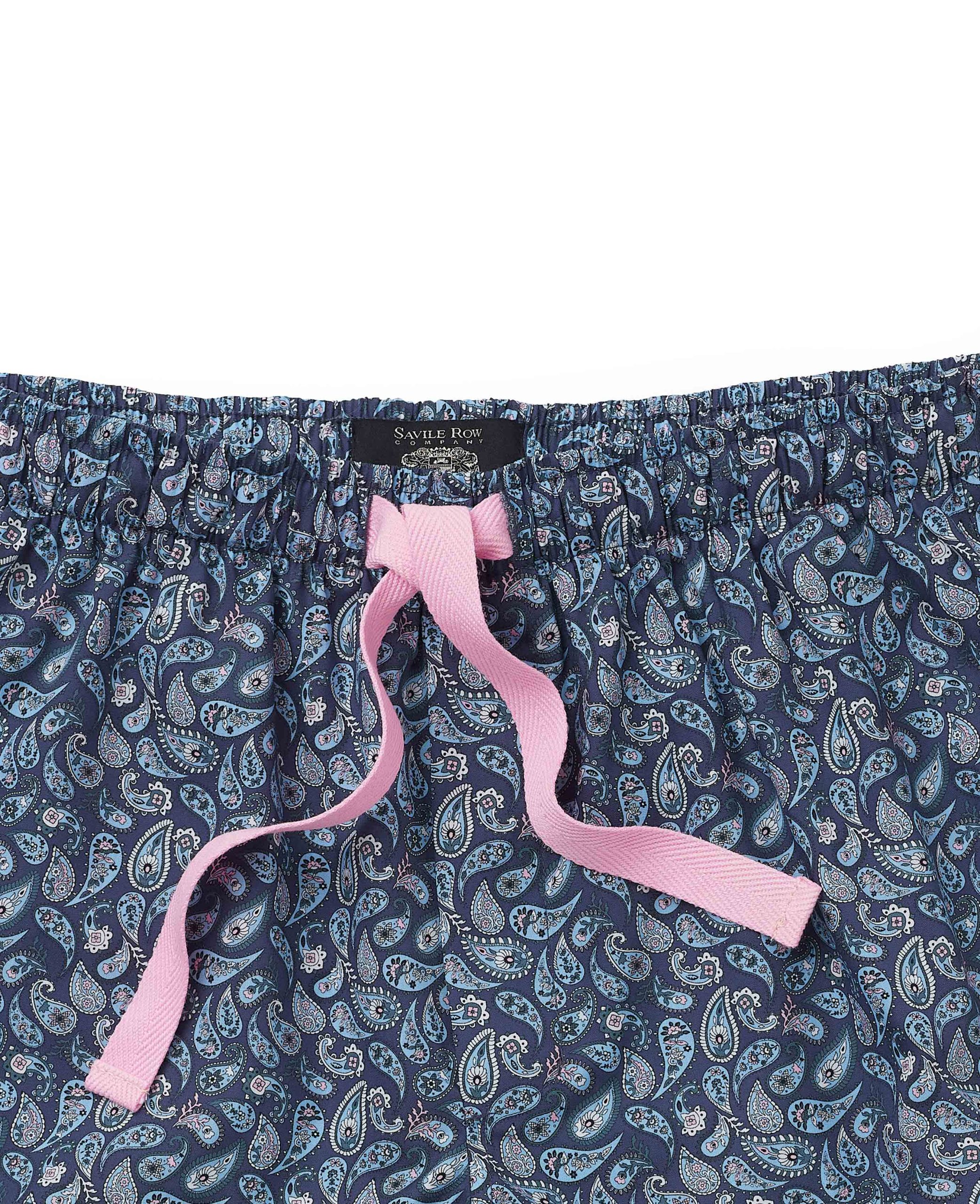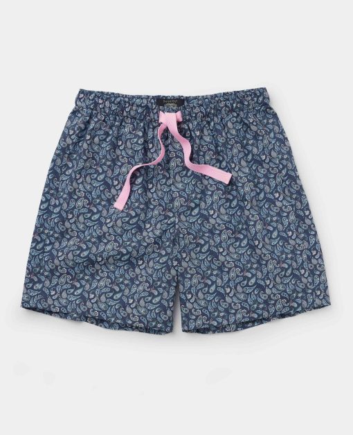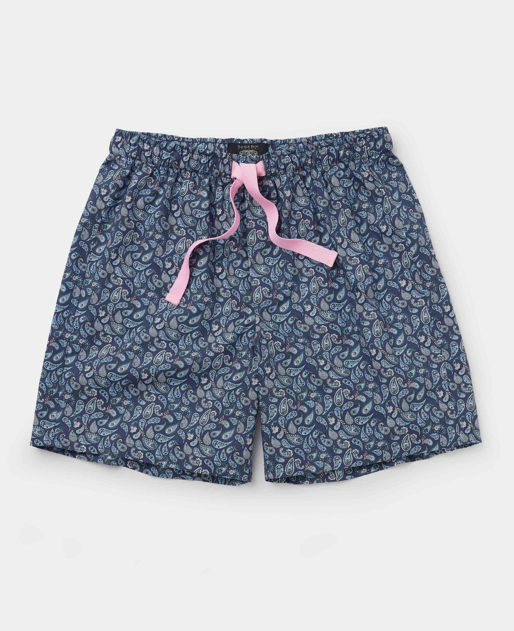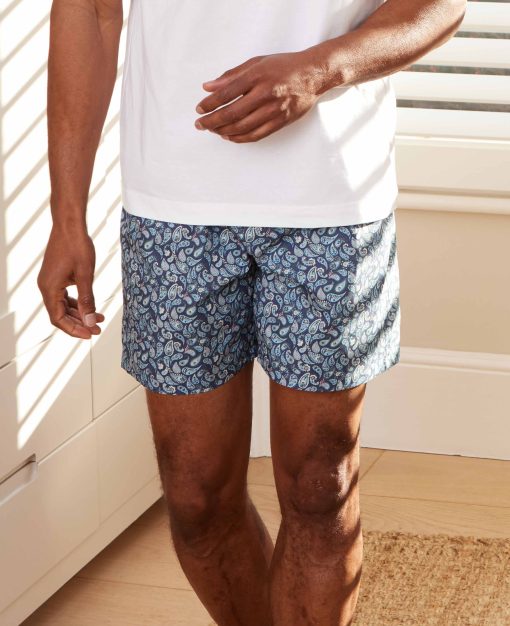 Breeze through laid-back days and restful nights in our men’s blue paisley lounge shorts. Whether you’re kicking back at home, enjoying a slow weekend morning or settling in for the night, these shorts are designed for pure comfort. Made from 100% cotton poplin, they’re cool, breathable and smooth to the touch, perfect for warm evenings or all-day lounging. The fully elasticated waistband with a contrast herringbone drawstring gives you an adjustable fit, while the buttoned working fly adds a practical touch. A single back pocket, embroidered with our signature logo, completes the design. Machine washable at 40°C, they’re as easy to care for as they are to wear.