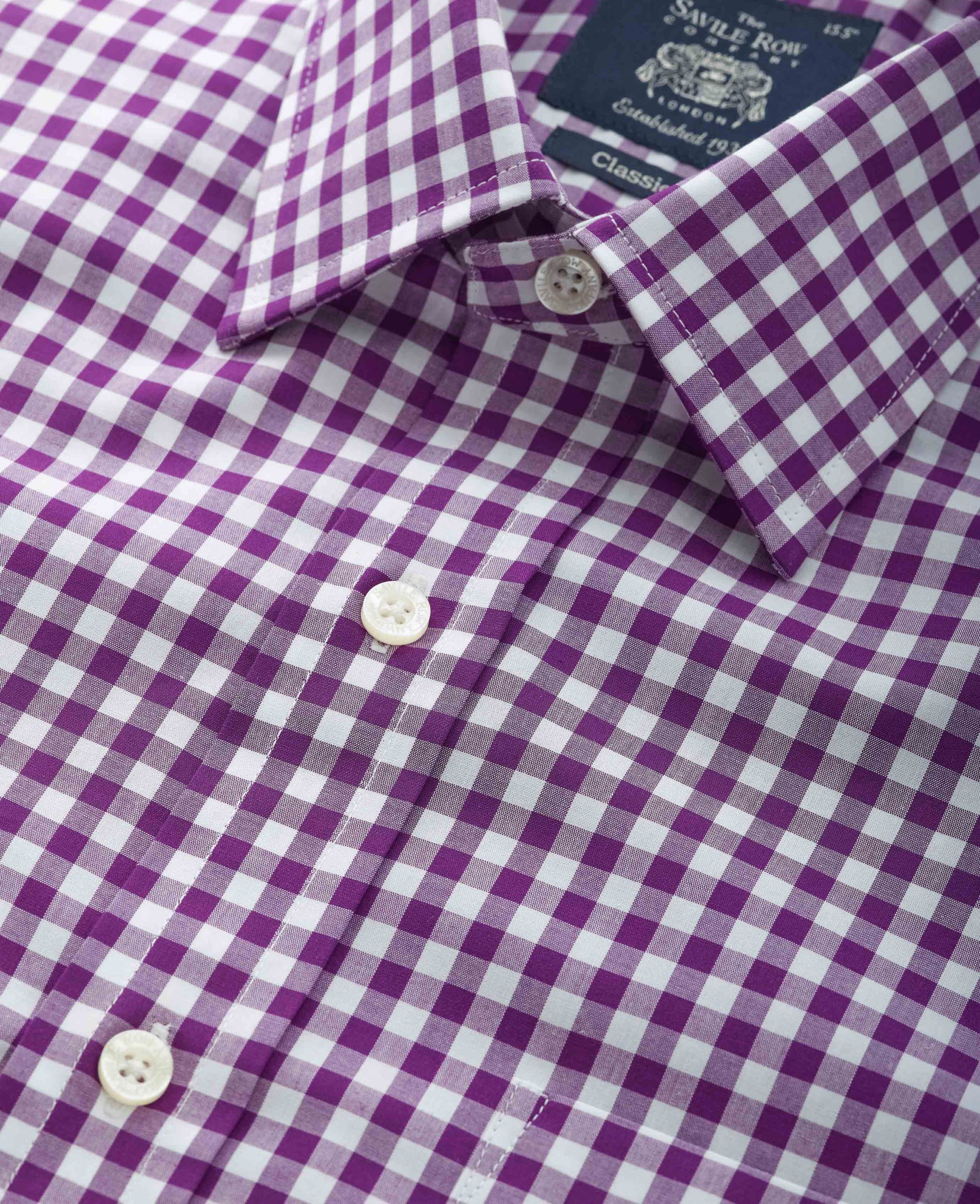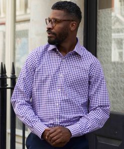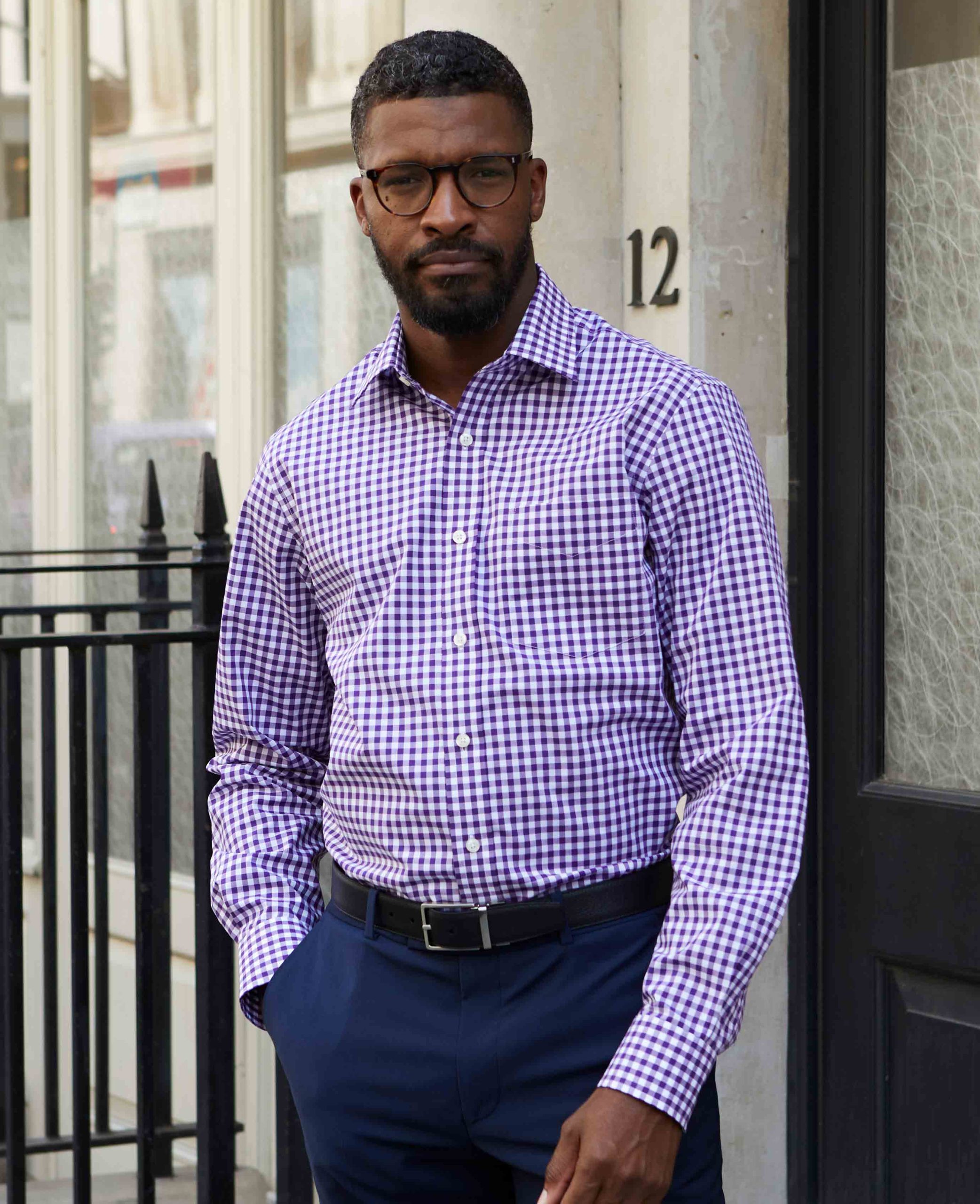 From lunches with clients to after-work drinks, this purple gingham shirt will help you look sharp for any occasion. It’s made from 100% cotton and features a crisp curl-resistant collar and single cuffs. You can wear yours with a tailored suit and tie, or simply team it a pair of smart trousers.