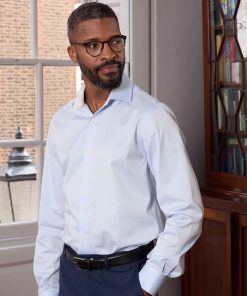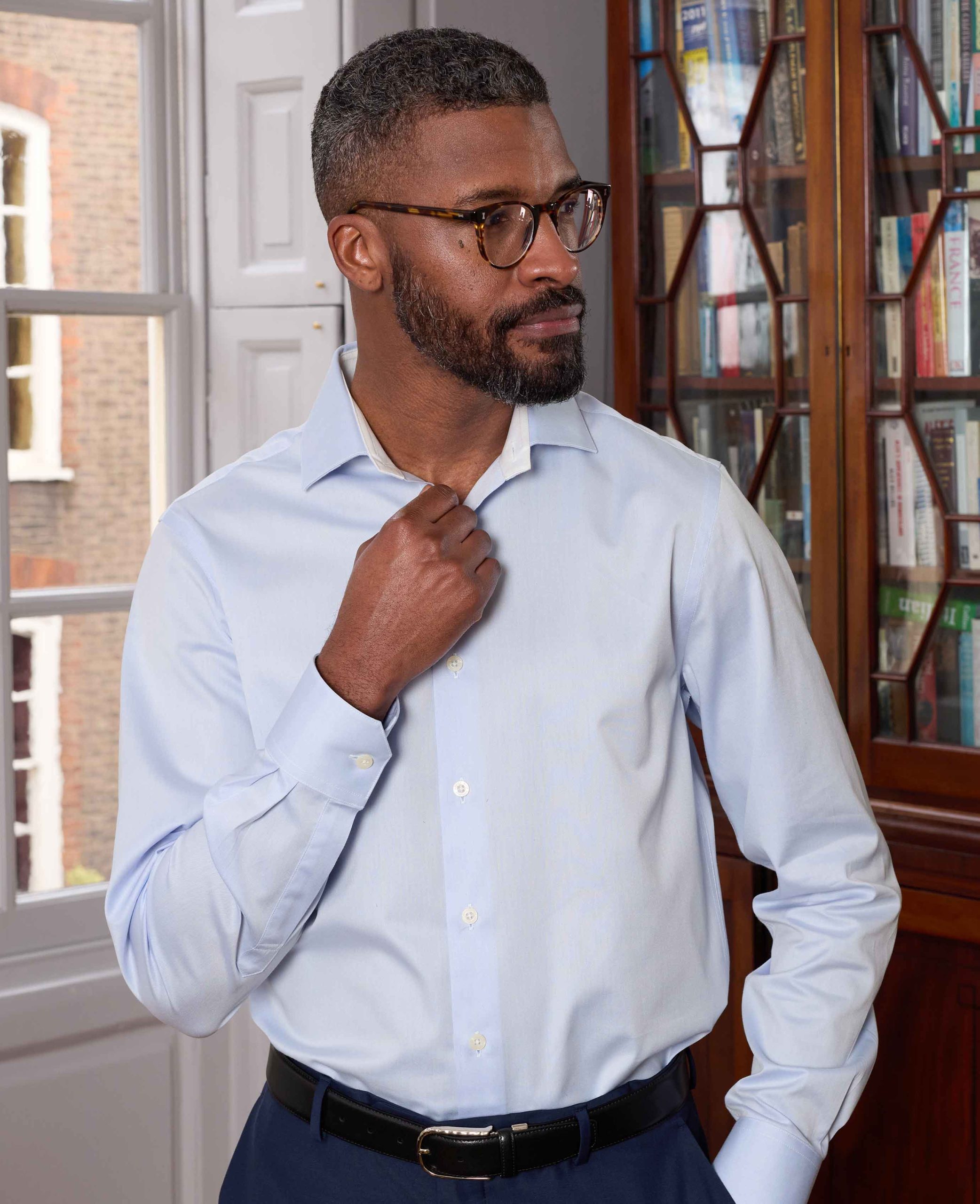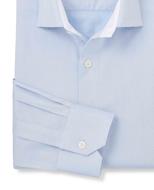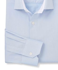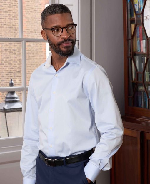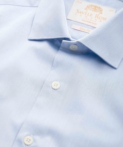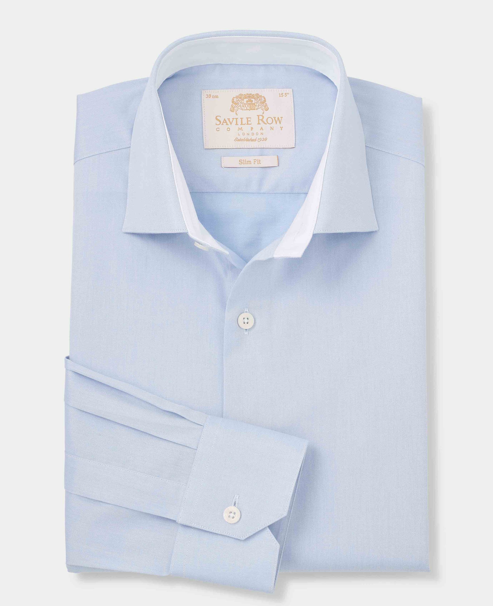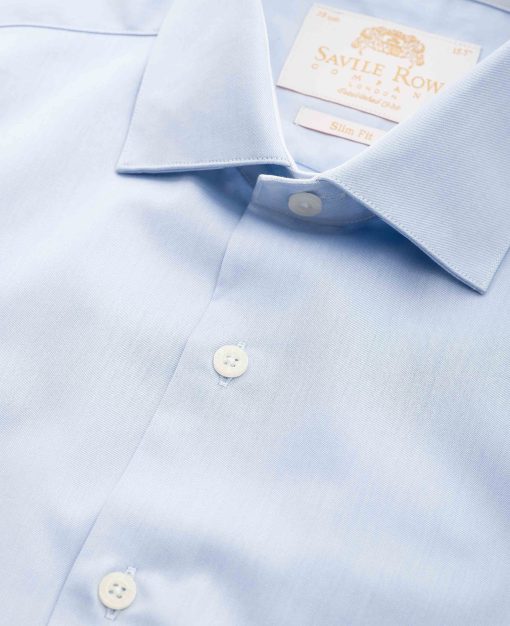 Refined, luxurious and expertly crafted, this sky blue slim-fit formal shirt is a cut above the rest. Made from premium two-ply 80/2 super fine twill cotton, it offers exceptional softness, durability and a smooth, supple finish. The two-ply construction – where two yarns are twisted together before weaving – enhances strength and longevity while providing a silky, high-end feel. Designed for a sleek, flattering fit with a gently tapered shape, it features a curl-resistant cutaway collar with integral and removable stays, ensuring a crisp and structured look. Thoughtful details such as the clean French front placket, mitred single cuffs and pucker-free French taped seams add to its polished aesthetic. A split back yoke enhances movement and fit, making this an impeccable choice for those who appreciate the finer things in formalwear.